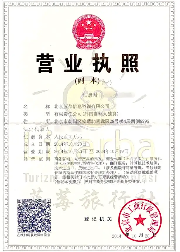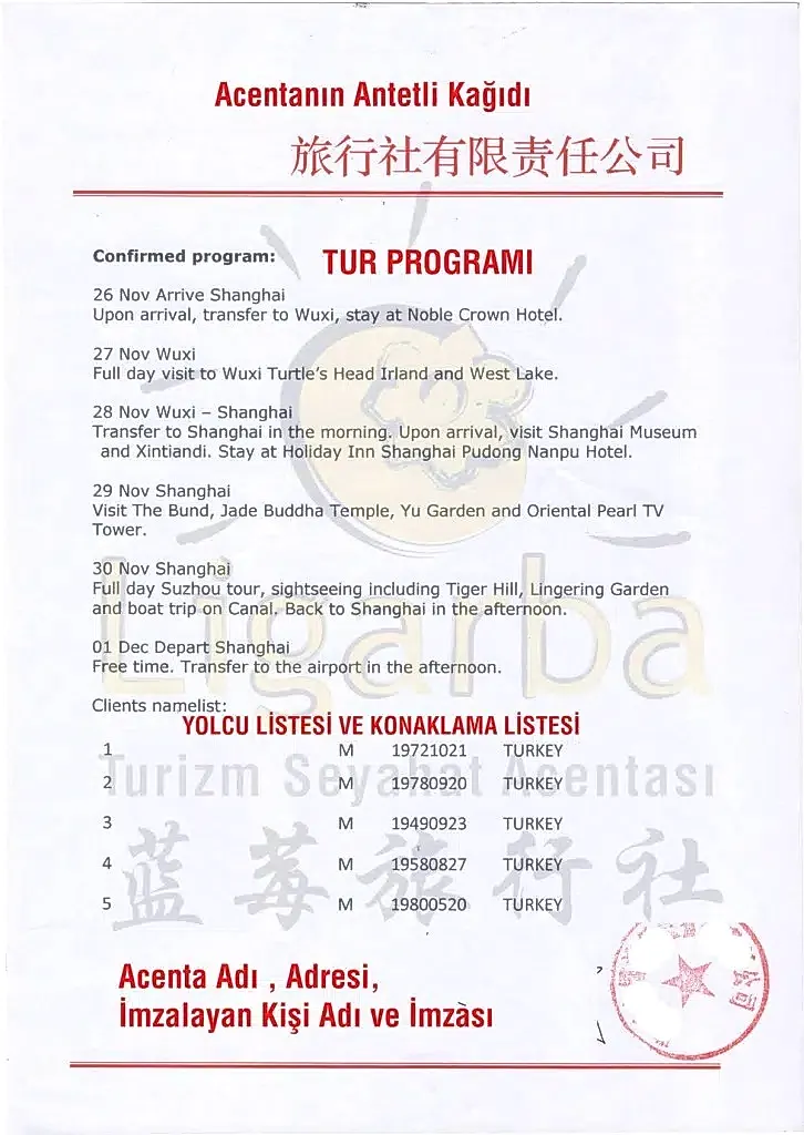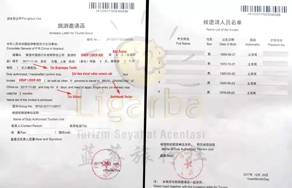 Çin grup vizesi başvurusu için Çin turizm bürosundan temin edilmesi gereken davetiye