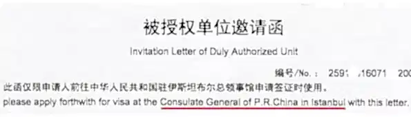 | Şirketin antetli kağıdına yazılmış davetiyenin aslını göndermenizi rica ederim | 需要您提供写在邀请公司抬头纸上的邀请函原件 |