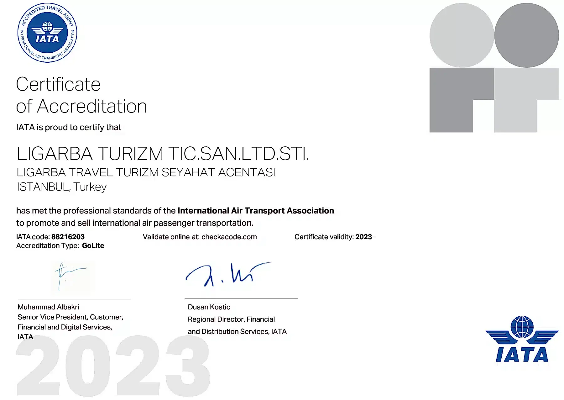 Uluslararası Hava Taşımacılığı Birliği ( IATA) üyesi olan Ligarba Turizm üzerinden, bütün havayollarının ( tarifeli uçuşlar ve charter uçuşları) biletlerini en uygun şartlarda temin edebilirsiniz.